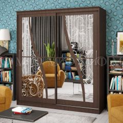 Достойное решение для современного интерьера. Обычный шкаф-купе за счет уникального дизайна приобретает новую эстетику. Большие зеркала декорированы пескоструйным рисунком.